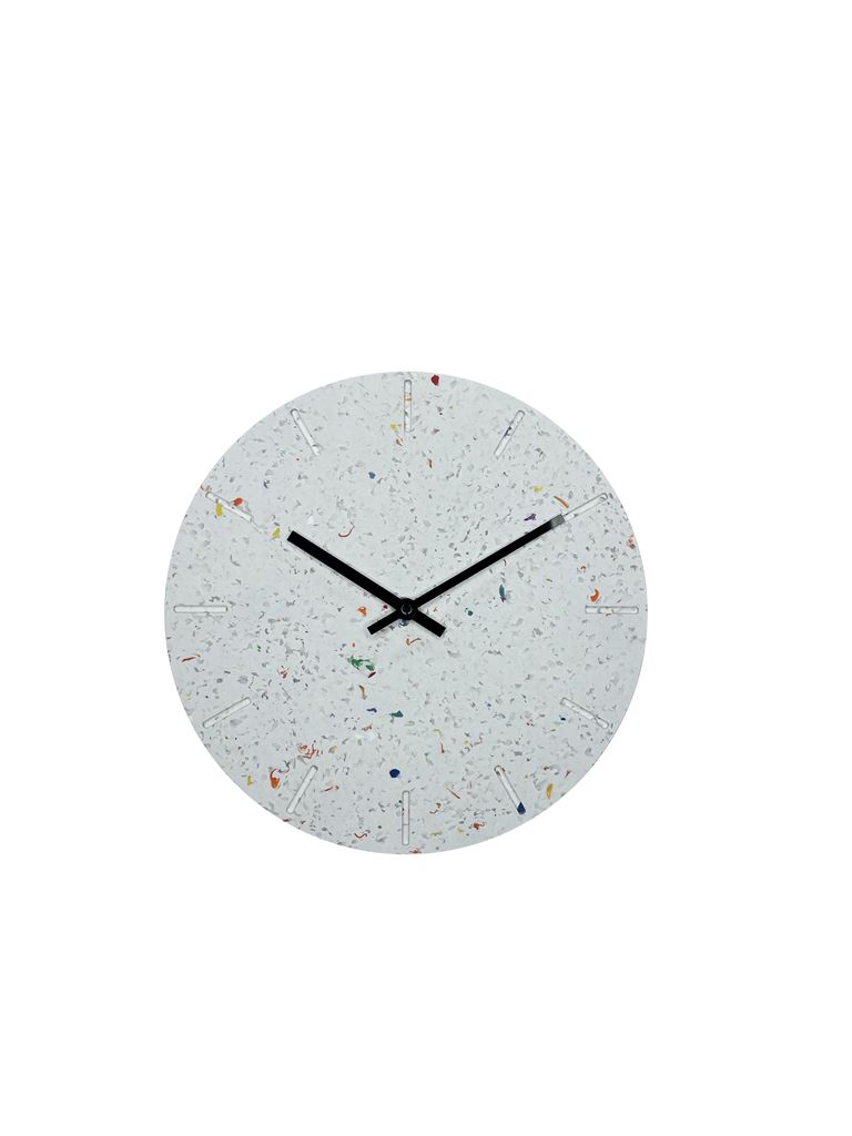 Pryd dit hjem med Hemverk RECY væguret, fremstillet af genbrugsplast. Dette ur forener moderne design med bæredygtig stil på smukkeste vis. Det unikke materiale har farverige stænk, der tilfører en legende, men elegant atmosfære til enhver indretning. Det minimalistiske design fremhæves af slanke visere i guld og sort, som elegant kontrasterer den livlige, multifarvede baggrund.