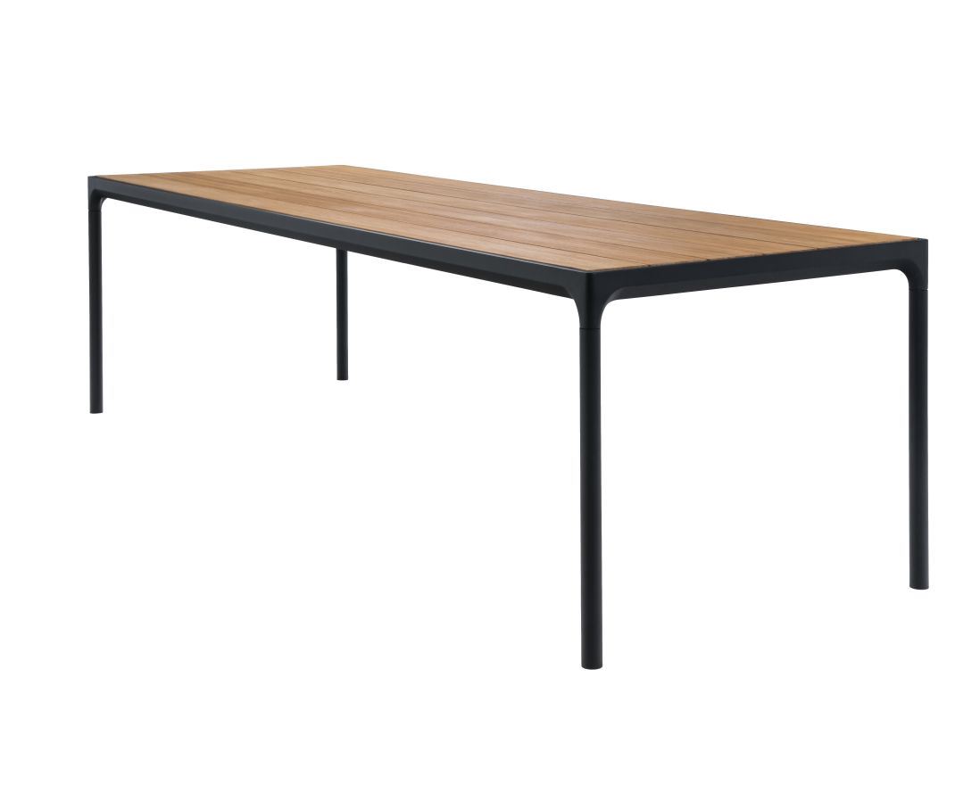 Lækkert havebord fra HOUE. Havebordet har en bordplade, som er lavet af bambus. Den naturlige overflade er neutral og komplimenterer derfor andre farver rigtig flot. Det sorte stel af aluminium, giver bordet et super fint udtryk. Det moderne og funktionelle bord er tidsløst og kan anvendes i mange år. Mix og match det med den havestol, der passer bedst ind i din stil. Serien Four fra HOUE laver også havebordet i 3 andre størrelser, udforsk brandet her på vores hjemmeside eller kontakt vores dygtige sælgere for den rette rådgivning. Serien Four har fået sit navn fordi at bordet har 4 ben, uanset hvilket størrelse du køber.