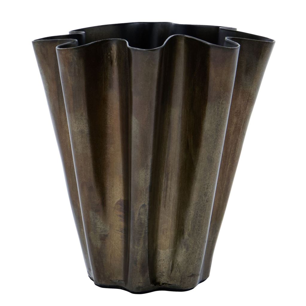 Med sin børstede sølvfinish og håndlavede, bølgede form tilfører denne vase rummet et råt, men elegant udtryk. Den fungerer som et markant blikfang, uanset om den placeres på en reol, et sofabord eller i vindueskarmen, hvor lyset fremhæver dens struktur og industrielle karakter