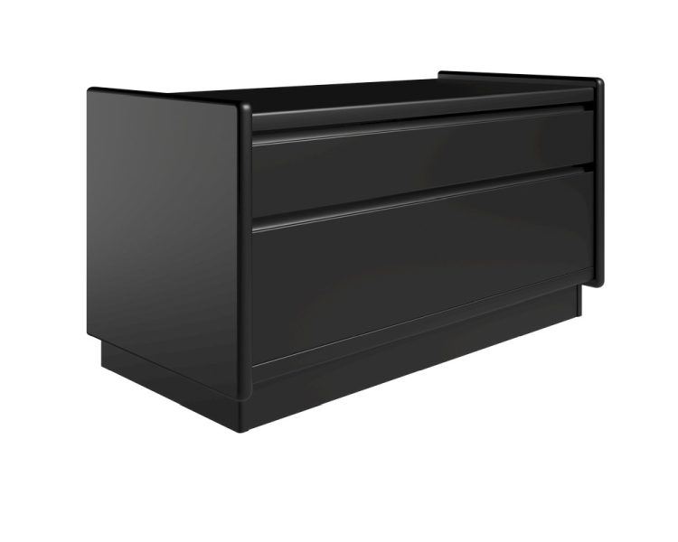 Sengebord fra danske Kaagaard. 228037 sengebordet har et enkelt design med elegante afrundede hjørner. Bordet består af en lav skuffe og en høj skuffe. Bordet er sortmalet og har et minimalistisk design, som med fordel kan tilføjes til eksisterende indretninger, og som passer ideelt i de skandinaviske indretninger.