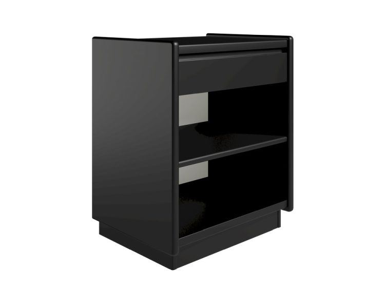 Sengebord fra danske Kaagaard. 315037 sengebordet har et enkelt design med elegante afrundede hjørner. Bordet består af en lav skuffe og to hylder med en masse plads til opbevaring. Bordet er sortmalet og har et minimalistisk design, som med fordel kan tilføjes til eksisterende indretninger, og som passer ideelt i de skandinaviske indretninger.