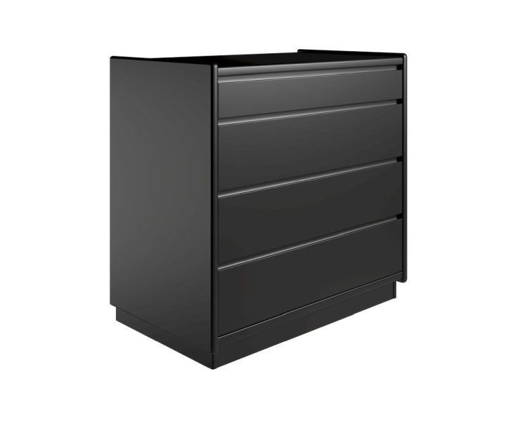 Kommode fra danske Kaagaard. Kommoden har 1 lav samt 3 høje skuffer. Den sorte farve giver kommoden et elegant udtryk og det minimalistiske design gør det nemt at tilføje kommoden i mange forskellige former for indretningssammenhænge, og så passer det ideelt ind i den skandinaviske og minimalistiske indretning. Kommoden giver bestemt plads til indretningen og kan bruges i næsten alle hjemmets rum. Stil den i stuen, soveværelset, børneværelset gangen eller entreen.