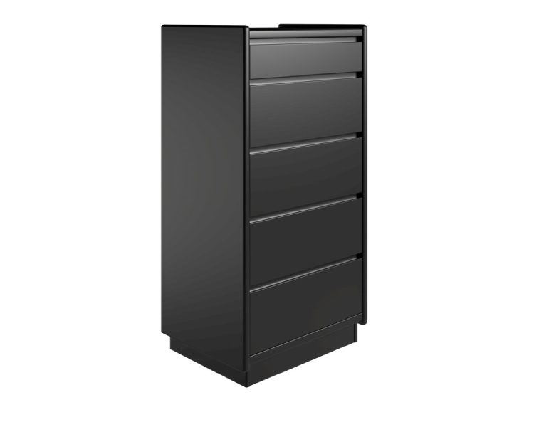 Kommode fra danske Kaagaard. Kommoden har 1 lav samt 3 høje skuffer. Den sorte farve giver kommoden et elegant udtryk og det minimalistiske design gør det nemt at tilføje kommoden i mange forskellige former for indretningssammenhænge, og så passer det ideelt ind i den skandinaviske og minimalistiske indretning. Kommoden giver bestemt plads til indretningen og kan bruges i næsten alle hjemmets rum. Stil den i stuen, soveværelset, børneværelset gangen eller entreen.