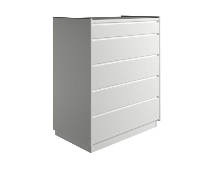 Elegant og minimalistisk kommode fra danske Kaagaard. Kommoden har 1 lav samt 4 høje skuffer. Kommoden har et enkelt udseende og den hvide farve gør det nemt at tilføje kommoden i mange forskellige eksisterende former for indretninger og passer ideelt til den skandinaviske minimalisme. Indretningen med kommoden er nem, den kan bruges i næsten hvert rum i hjemmet. Placer den for eksempel i entreen, gangen, soveværelset, stuen eller børneværelset.