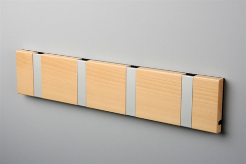 Super flot og elegant knagerække fra KNAX. Knagerækken kommer i en flot lakeret bøg og grå knager. Den er stilfuld og dermed kan den bruges i mange indretninger. Brug knagerækken i entréen, stuen, soveværelset eller måske køkkennet. Knagerækken er 39,6 cm lang og 7,9 cm høj. Knagerækken har 4 knager. Alle knager er med vippefunktion.