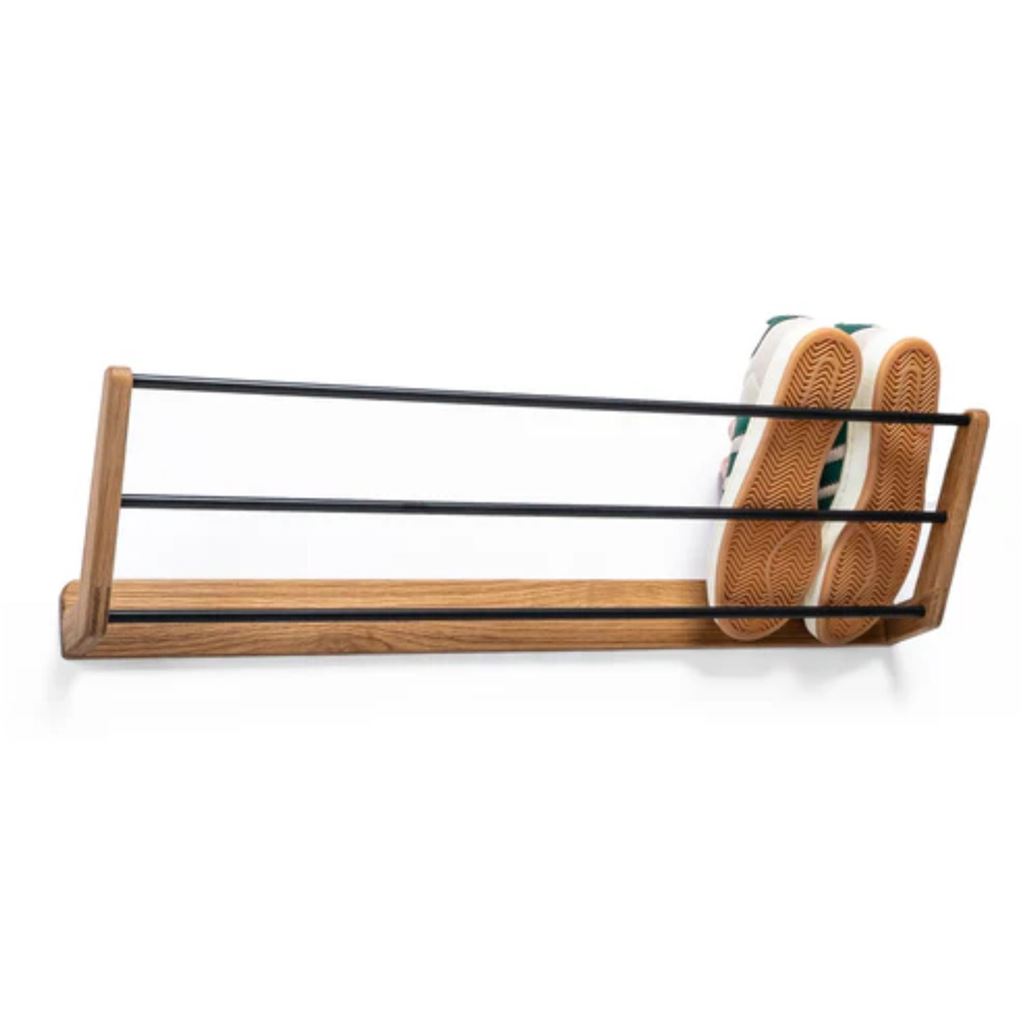 Sig farvel til rod i entréen med MILO skohylden. Det gennemtænkte design placerer skoene skråt i stedet for vandret, hvilket frigiver plads og giver et let, velorganiseret udtryk. MILO er fremstillet i massivt egetræ kombineret med sortlakerede metalstænger og kan monteres i flere niveauer for at optimere din skoopbevaring