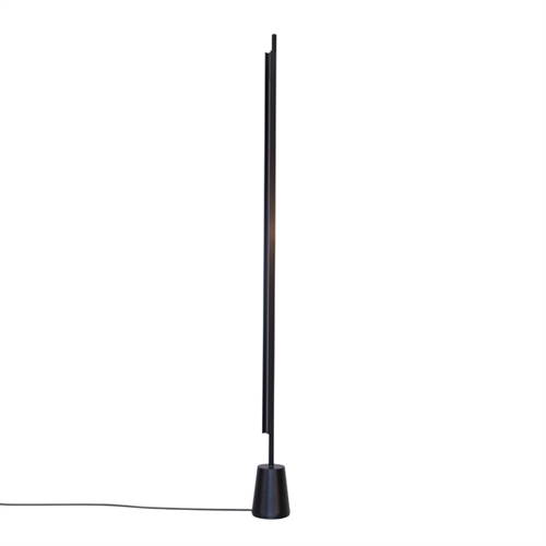 Meget smuk og enkel gulvlampe fra italienske Luceplan. Gulvlampen består af en konisk base lavet af formstøbt zink og lampens stamme er fremstillet af aluminium, hvori der er placeret en række LED-lys. Stammen kan drejes for at justere propotionerne af direkte og reflekteret lys som lampen afgiver, og den er også udstyret med en lysdæmperkontakt.