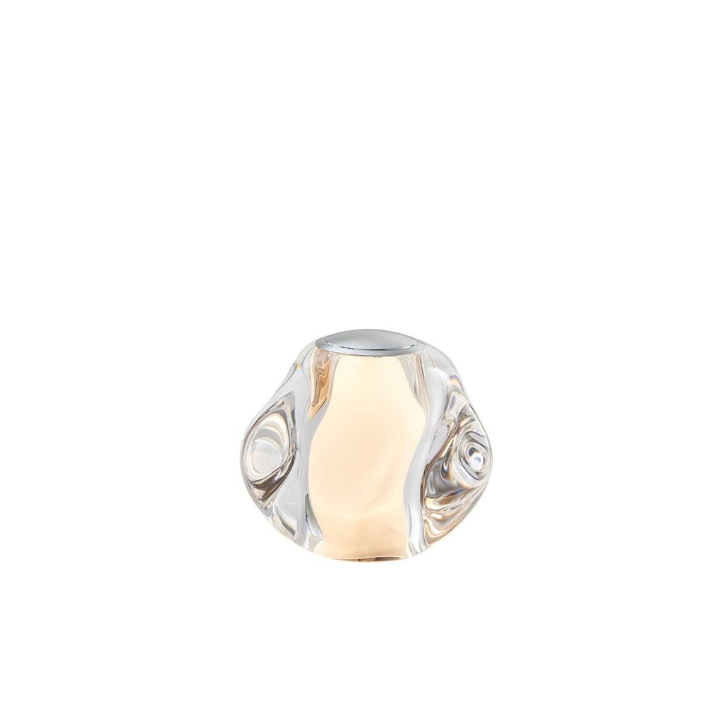 ICE BALL krom batteri bordlampen kombinerer stil og funktionalitet på en elegant måde. Med sin transparente form og kromplade på toppen, der muliggør dæmpning, tilføjer denne lampe et strejf af moderne æstetik til ethvert rum. Dens organiske form i klar akryl, der næsten ligner glas, giver den et unikt og sofistikeret look.