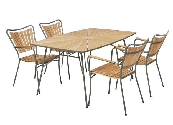 Stellet i aluminium er pulverlakeret med en flot olivengrøn farve. Stolene har et ryglæn, sæde og armlæn af teak.