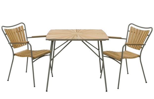 Stellet i aluminium er pulverlakeret med en flot olivengrøn farve. Stolene har et ryglæn, sæde og armlæn af teak.