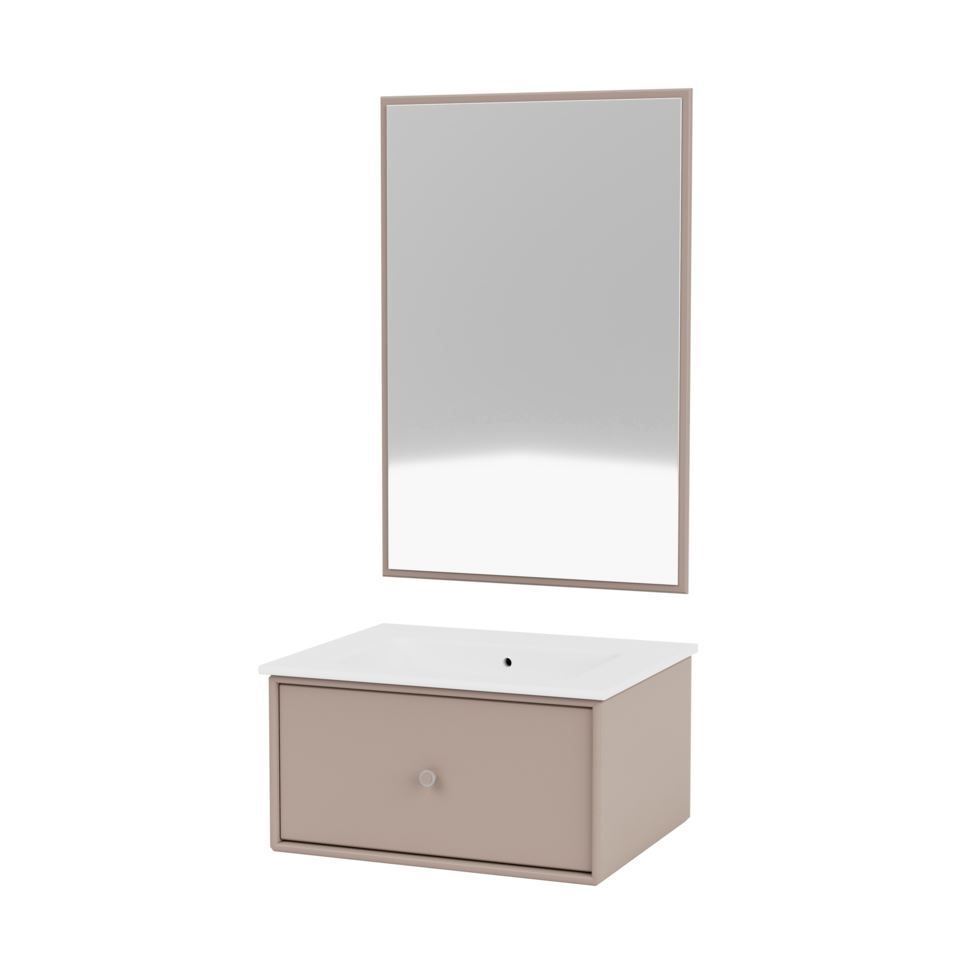 Smukt og funktionelt badeværelseskomposition. Med denne har du mulighed for at sætte dit eget personlige præg på badeværelsesindretningen. Denne komposition består af et modul med vasken integreret i bordpladen samt et rektangulært spejl. Derudover indeholder modulet en lille skuffe, hvor du nemt kan opbevare de ting, der ikke nødvendigvis behøver så fremme.