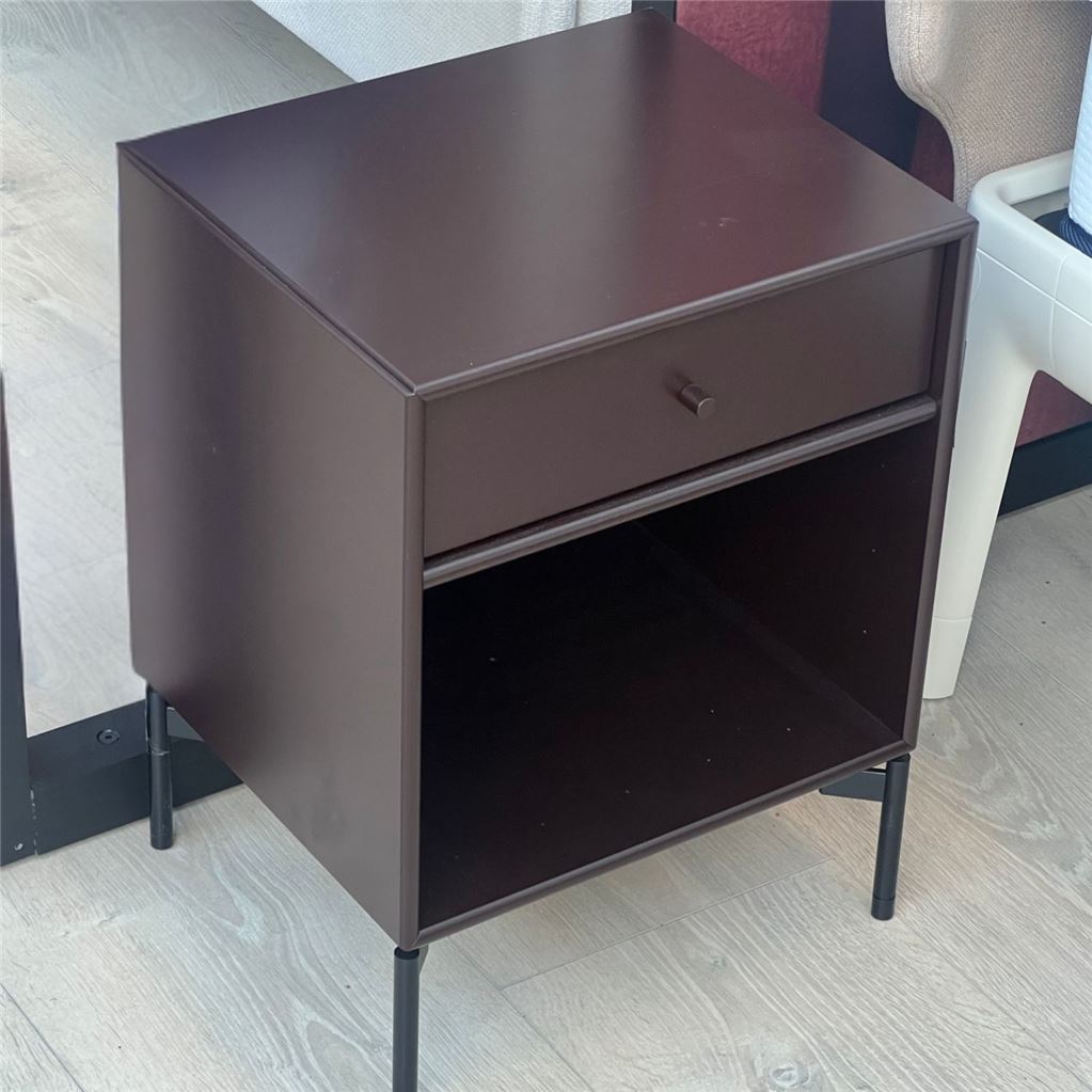 Smukt sengebord med ben fra Montana. Med det fine sengebord kan du opbevare dine vigtigste ting til natten i den medfølgende skuffe samt praktiske hylde, som kan rumme dine yndlingsmagasiner og -bøger. Sengebordet er ikke blot funktionelt, men også yderst stilrent og æstetisk, hvorfor det vil tilføre en smuk detalje til enhver indretning. Brug også bordet som et fleksibelt sidebord til stuen eller som en del af entreen til at opbevare sager, der er rare at have ved hånden, når man er på vej ud ad døren.