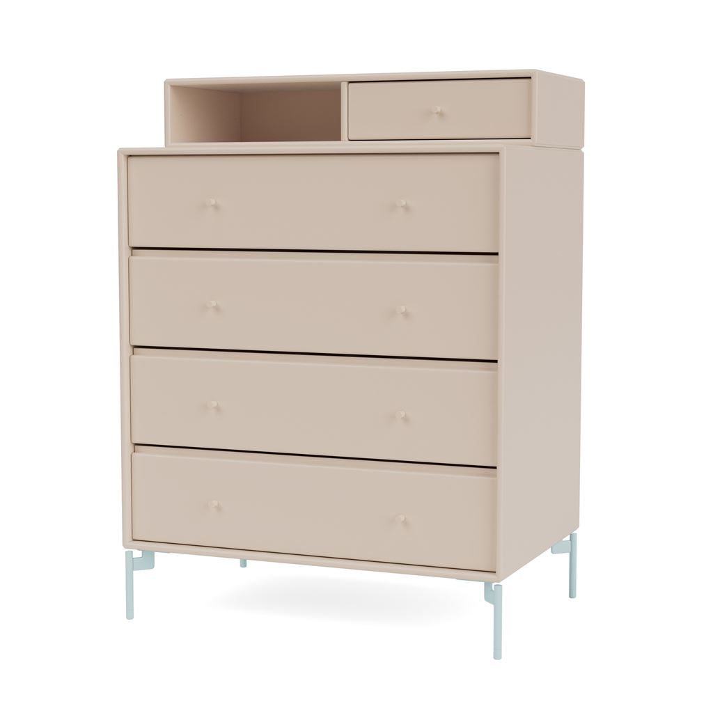 Smuk kommode med ben fra Montana. Med kommodens fire rummelige skuffer er den ideel til opbevaring af personlige gentande i soveværelset eller som en praktisk opbevaringsløsning til enten stuen eller entréen. Kommoden har et åbent rum samt et lille skuffemodul øverst, som passende kan rumme dine smykker, kalender eller andre småting. Det øverste hyldemodul kan nemt hænges for sig selv, således kommoden anvendes alene, hvis man ønsker fornyelse i sit Montana møbel. Kommodens skarpe og rene linjer gør, at det ikke alene er et funktionelt og alsidigt møbel, men også et minimalistisk og æstetisk element i enhver indretning.