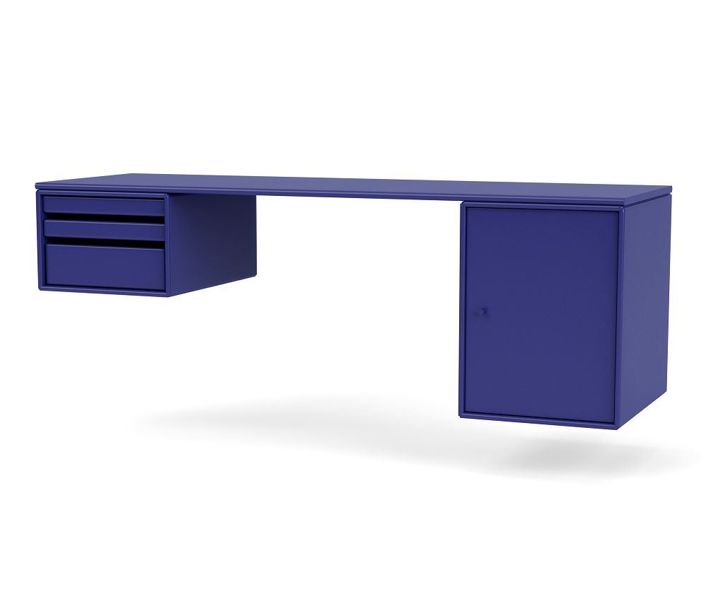 Smukt og praktisk skrivebord fra Montana. Det skønne skrivebord har både et rummeligt skabsmodul i den ene side, hvor mapper og bøger kan opbevares på diskret vis, samt tre bakker, som kan tages helt ud, i modsatte side. På den måde kan man nemt skabe sig et overblik over bakkernes indhold. Brug eksempelvis bakkerne til at rumme kontorartikler og hobbyting, som hurtigt og nemt kan findes frem og gemmes væk igen. Som arbejdsplads har skrivebordet en god længde, hvor der er plads til fordybelse, og dets praktiske størrelse muliggør at integrere det i eksempelvis stuen eller hjemmekontoret. Med Montanas velkendte formsprog bestående af rene og skarpe linjer kombineret med de mange skønne farvemuligheder, som de lakerede fronter kommer i, er det et møbel, der vil tilføre en smuk detalje til indretningen. Vær kreativ ved at kombinere skrivebordet med andre skønne farverige opbevaringsmøbler fra Montana for ekstra opbevaring og til at kunne udtrykke din helt egen personlige stil i indretningen af din arbejdsplads i hjemmet.