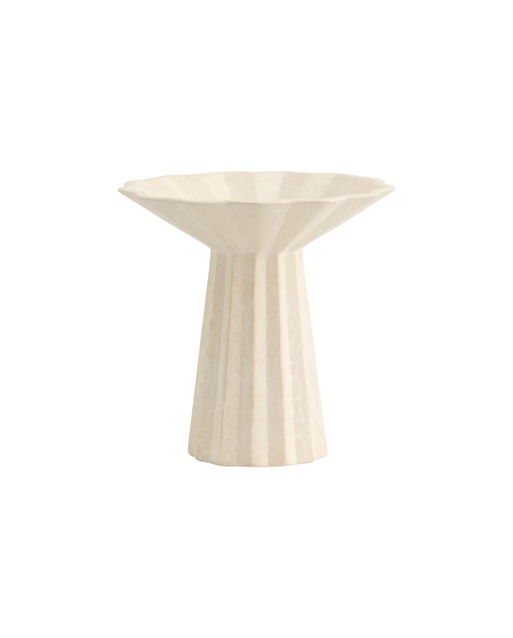 MINU vasen er en skulpturel mesterværk, håndlavet i keramik med en råhvid, tekstureret overflade. Det rillede mønster, der pryder vasen, åbner sig op som en elegant vifte øverst, hvilket tilføjer et kunstnerisk element til ethvert rum. Denne vase er designet til at give dine blomsterarrangementer et fortryllende udseende og enestående præsentation. Med dens unikke form og teksturerede finish tilføjer den et strejf af elegance og stil til enhver indretning.