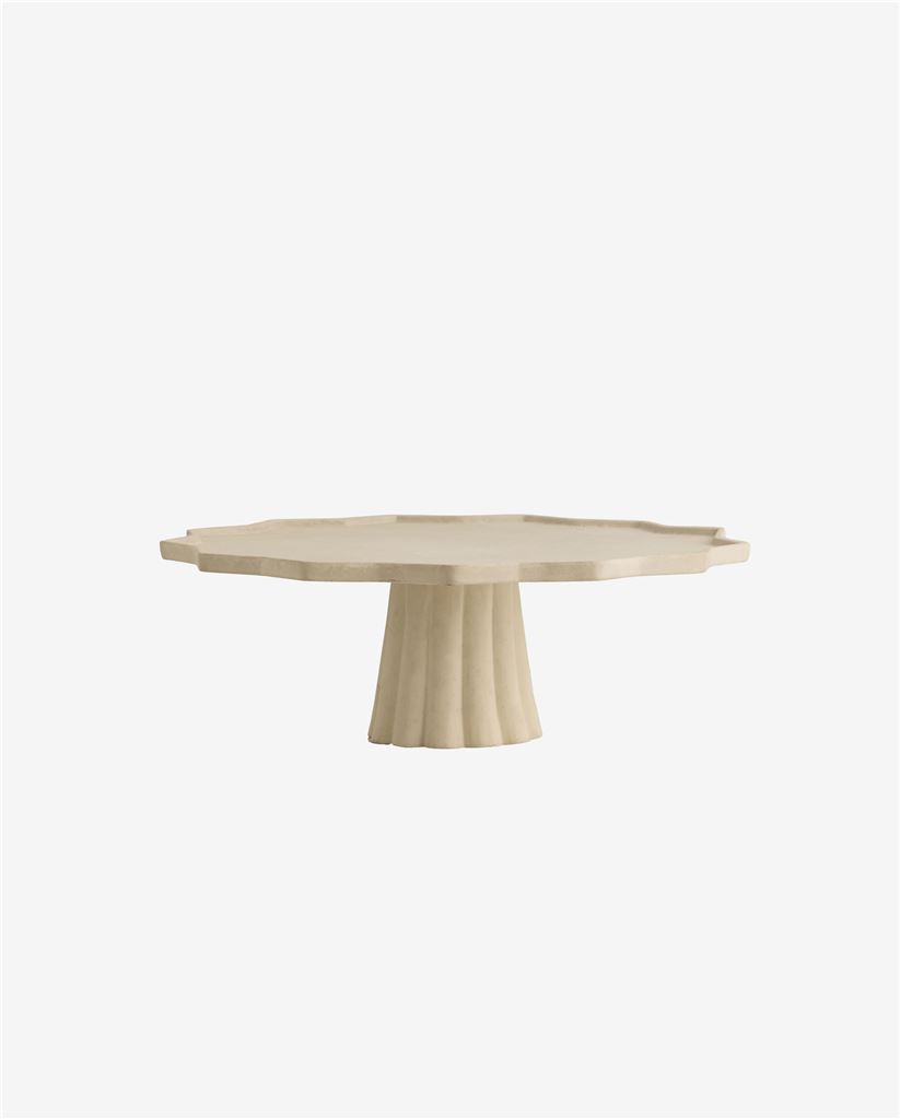 Den runde form, de let bølgede kanter og de lodrette riller på foden giver fadet et klassisk og sofistikeret udtryk, hvor de plisserede detaljer tilføjer en særlig charme. Perfekt til servering af kager og andre lækkerier, samtidig med at det fungerer som et dekorativt midtpunkt på bordet.