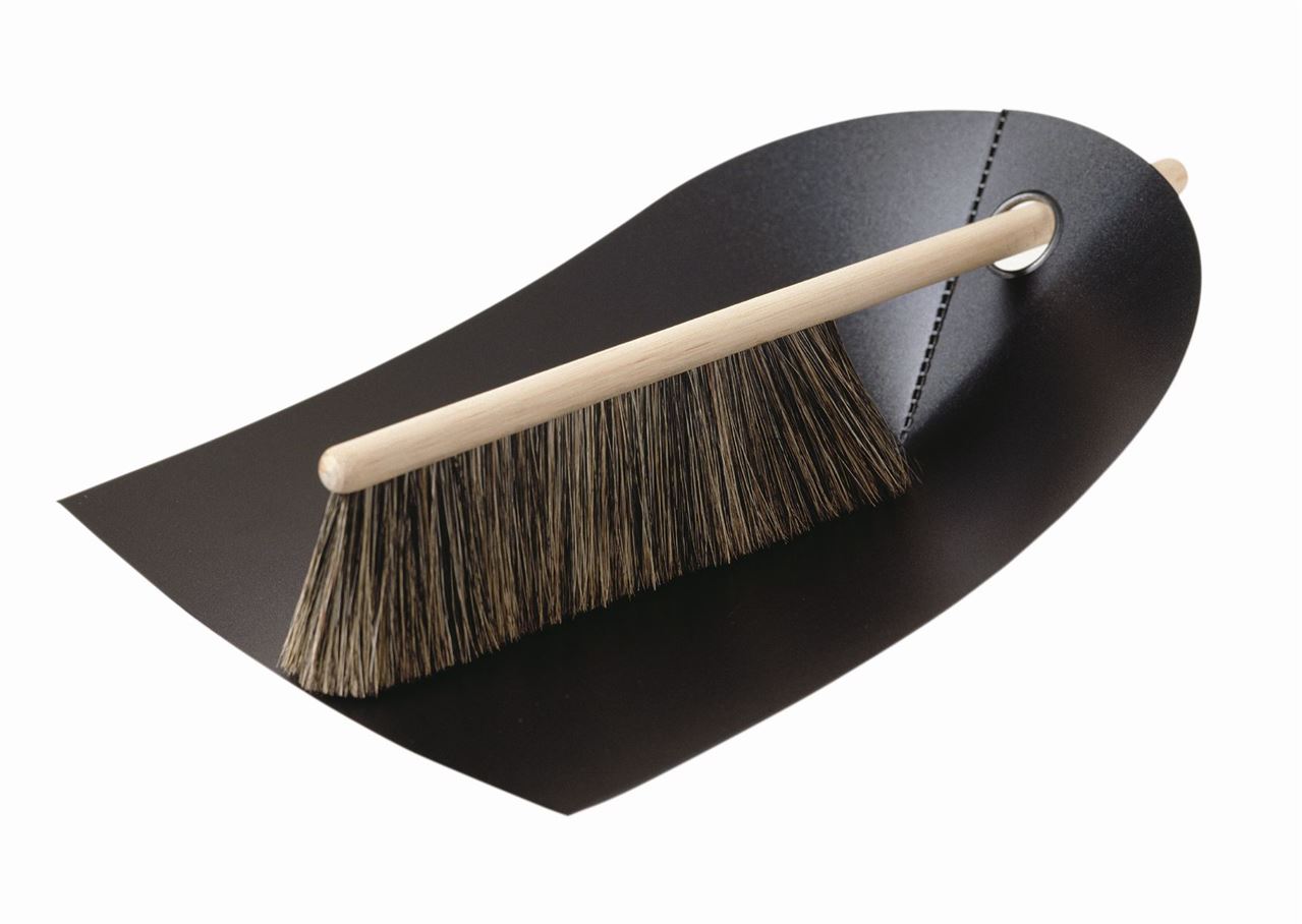 Denne minimalistiske fejebakke med kost er designet af Ole Jensen, der blev inspireret af en foldet avis simplicitet. Den består derfor i al sin enkelthed af et stykke foldet plastik, der med sin unikke form ligger godt i hånden. Kosten er lavet af træ og naturhår, der sikrer et holdbart stykke håndvært, der samtidig har et enkelt designudtryk.
