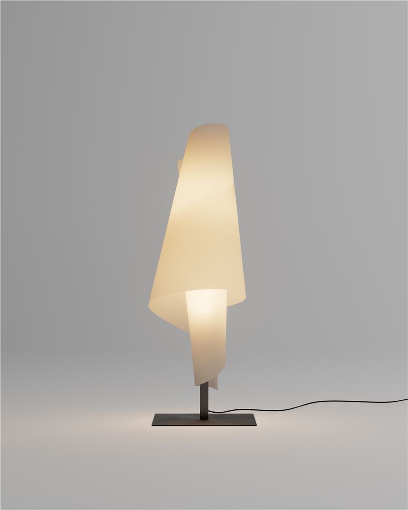 ALTA COSTURA er en lampe, der består af en diffuser, som omslutter en stålmast med en struktureret sort finish. Lampen bevarer sin form takket være speciallavede knapper, som forsigtigt skrues på bagsiden. Når kunden monterer lampen, efterligner de skrædderens omhyggelige arbejde. Lyskilden udsender et varmt og beroligende lys med tekstur.
