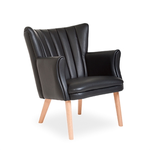 Skøn og klassisk lænestol fra Skipper Furniture. Teddy er en let og komfortabel lænestol med fastpolstret sæde og ryg. Den fylder ikke meget i rummet, men den udstråler både hygge og atmosfære. De lodrette inddelinger (piber) i ryggen, leder tankerne tilbage til 50érne, hvor stolen blev lanceret. Stolen er betrukket med sort Elegance læder, et semi anilin læder af oksehuder.