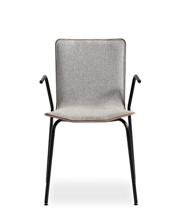Den smukke spisebordsstol med armlæn og polstreret sæde fra danske Skovby er en klassisk spisestuestol, der passer flot til både spisestuen og spisebordet i køkkenet. Den formstøbte skal i egetræsfinér har et let kantet grafisk design, som giver stolen et moderne udtryk.