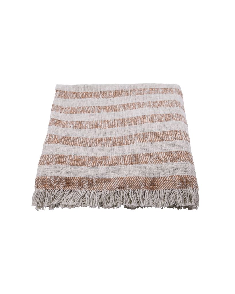 Sofaen, en kop te og dette hyggelige tæppe fra House Doctor. De smalle striber i det bløde bomuldsdesign og de neutrale farver med frynser passer til enhver indretningsstil. For at skabe sammenhæng i dit sofahjørne, kan du kombinere tæppet med puder i lignende brune nuancer for at tilføje masser af hygge. Tæppet er også perfekt at tage med ud, når du vil nyde en kop kaffe i solen.