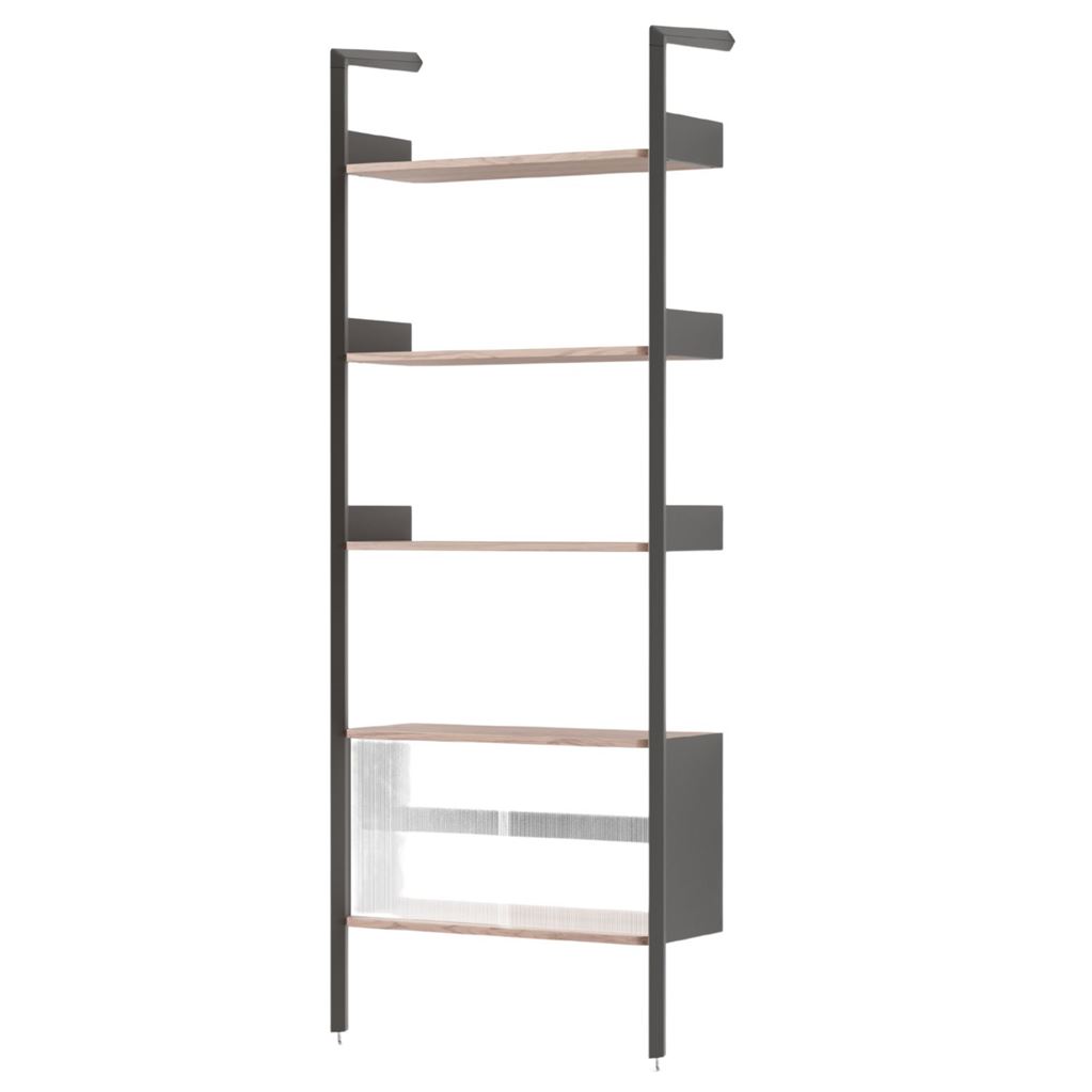 Denne reol inkluderer et skab med rillet glaslåger, der elegant skjuler indholdet uden at lukke det helt inde.