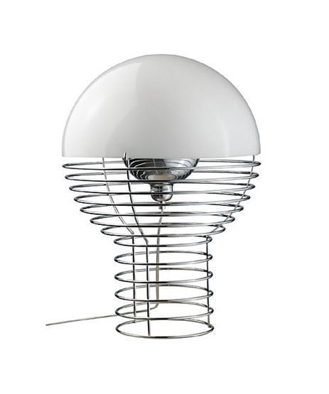 Den unikke Wire bordlampe er designet af Verner Panton i 1972. Lampen har en forkromet stålramme, som øverst udvides for at understøtte den hvide halvkugleformede lampeskærm, bordlampens form minder om en pære, og Verner Panton har tænkt på enhver detalje til denne lampe. Den hvide, halvkugleformet lampeskærm sørger for at fordele lyset på en blød, skøn måde uden at blænde. Det er en unik lampe, som med dens enkelte design passer ind i rigtige mange former for indretning. Lampen har en 220 cm transparent plastikledning med afbryder, og benytter sig af en E27 fatning. Pære medfølger ikke.