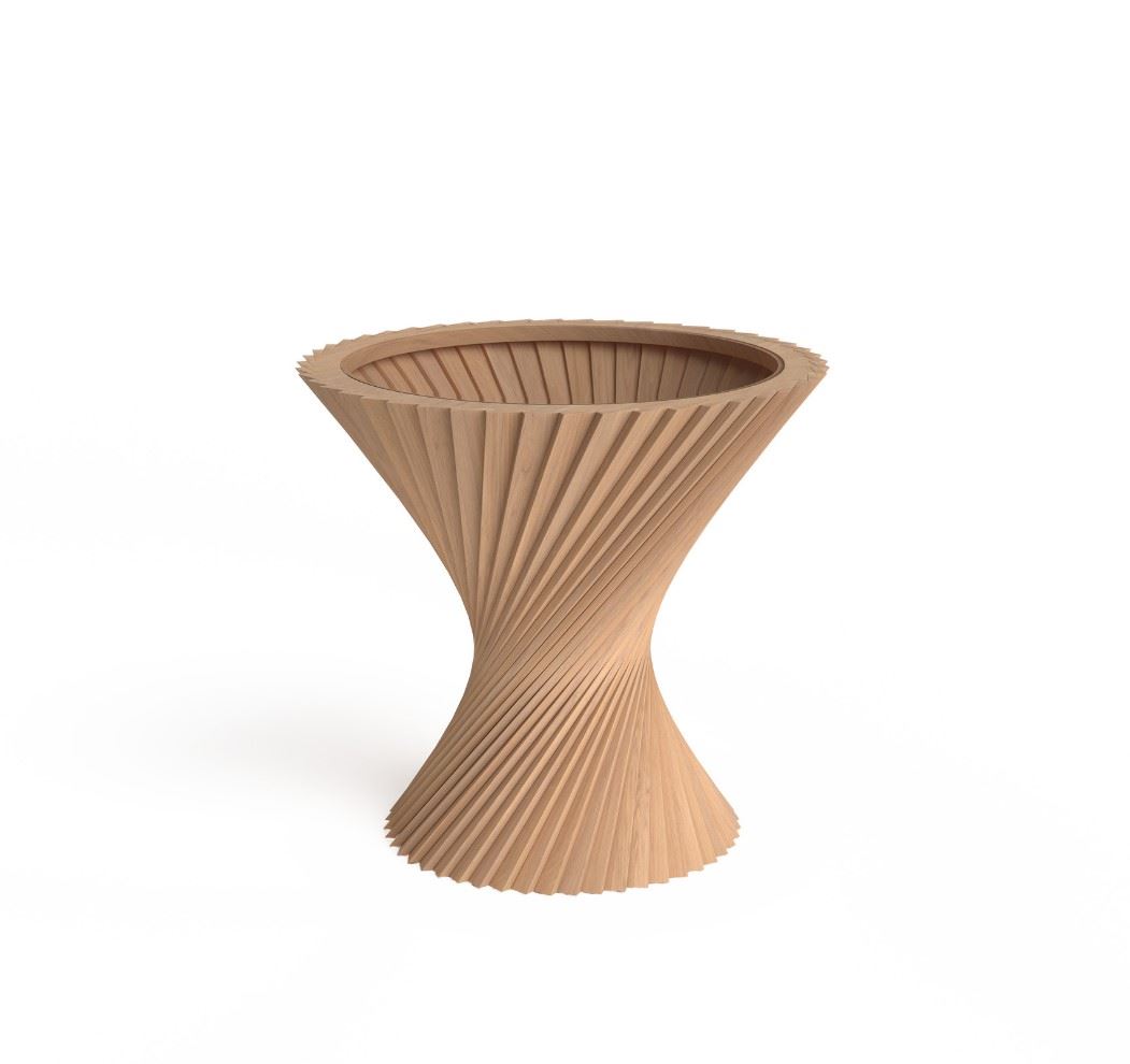 Hyperbel sidebordet fra VIA Copenhagen er tegnet af Christian Winther Johannsen som en gave til sin hustru i 2015. Dette skulpturelle sidebord kombinerer matematikkens love og naturlige materialer. Bordet består af 48 træstykker der er blevet samlet med stor præcision.