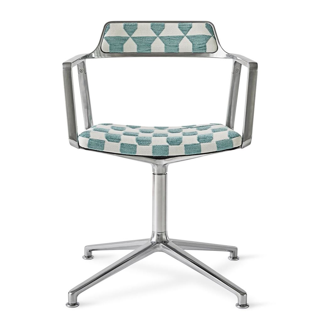 Denne specialudgave af Vipp Swivel-stolen er betrukket med et iøjnefaldende tofarvet møbelstof, inspireret af et middelalderligt våbenskjold. Stolen er designe