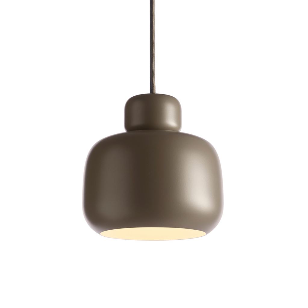 Lampen er fremstillet i malet metal og har en matchende stofbeklædt ledning. Stone fås i flere farver og størrelser, hvilket gør den ideel til alt fra køkkenøen og sofahjørnet til natbordet